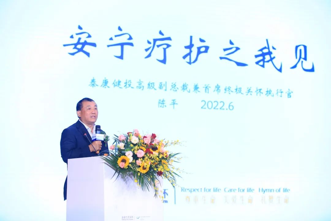 泰康健投高级副总裁兼首席生命关怀执行官陈平发表《安宁疗护之我见》的主题演讲,解读了泰康安宁疗护的创新商业模式,他表示,要通过创新商业模式降低成本费用,让更多人可以享受服务。即通过“安宁疗护+生命礼仪服务”优势互补,走出中国特色的安宁疗护发展之路。▲泰康健投高级副总裁兼首席生命关怀执行官陈平发表《安宁疗护之我见》主题演讲