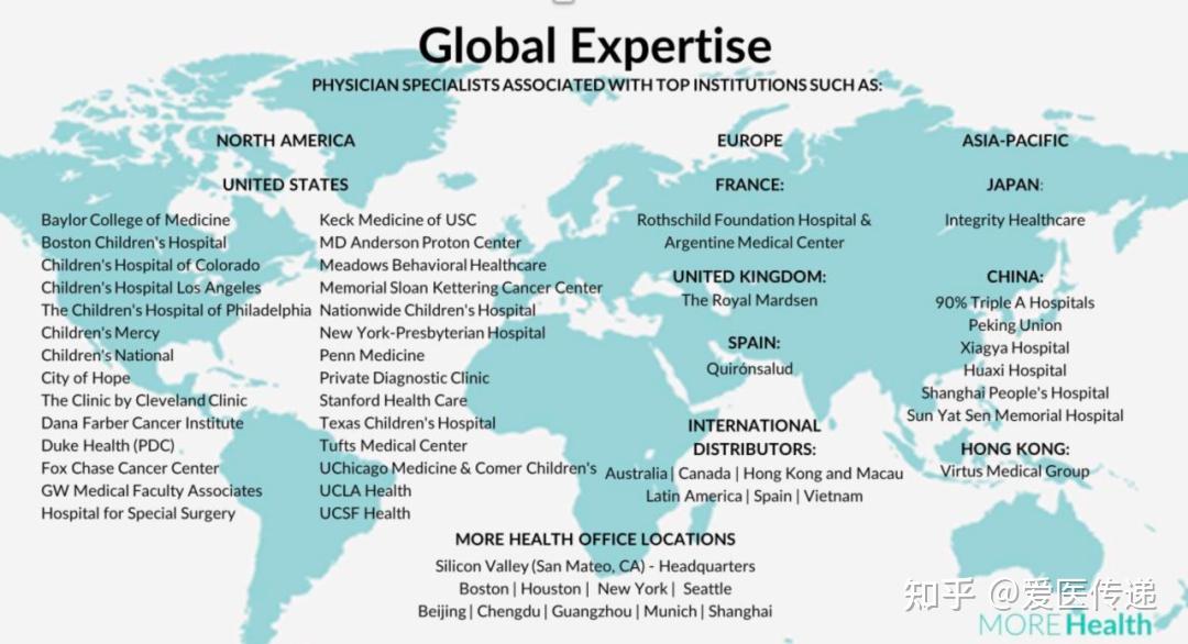 MORE Health与众多国际TOP级医疗中心均有长久且深度合作,拥有覆盖肿瘤、儿科、神经、心脑血管、辅助生殖科学和罕见病等领域的100,000+医生专家资源库;合作的医院包括但不限于以下: