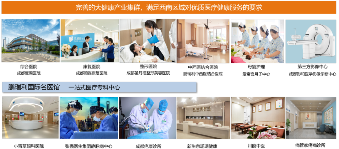 成都鹏瑞利国际医疗健康中心建筑面积28万㎡,已入驻开业医疗健康品牌15家,床位数700余床,手术室29间(包括百级手术室5间,负压手术室1间),并配备有MRI、PET-CT等大型医学影像设备。自2018年开业以来,已成为西南区域一站式医疗健康生活新地标。